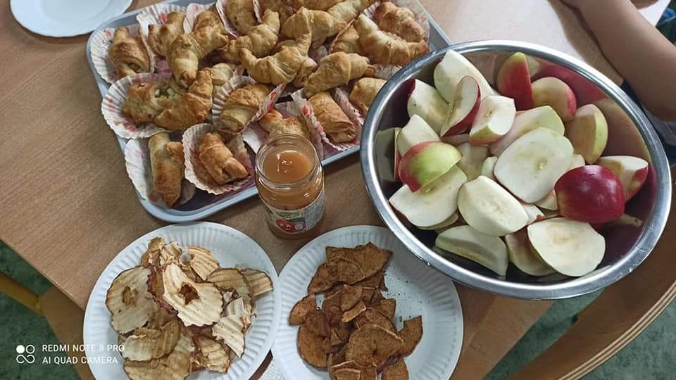 28 września świętowaliśmy Dzień Jabłka. Próbowaliśmy, porównywaliśmy i rozmawialiśmy o tych owocach, ich formach i przeznaczeniu. Piekliśmy jabłecznik, jabłka pod kruszonką, francuskie rogaliki z jabłkiem, zapiekaliśmy jabłka z konfiturą, oraz tłoczyliśmy sok. Dzieci stwierdziły, że były to najsmaczniejsze zajęcia.