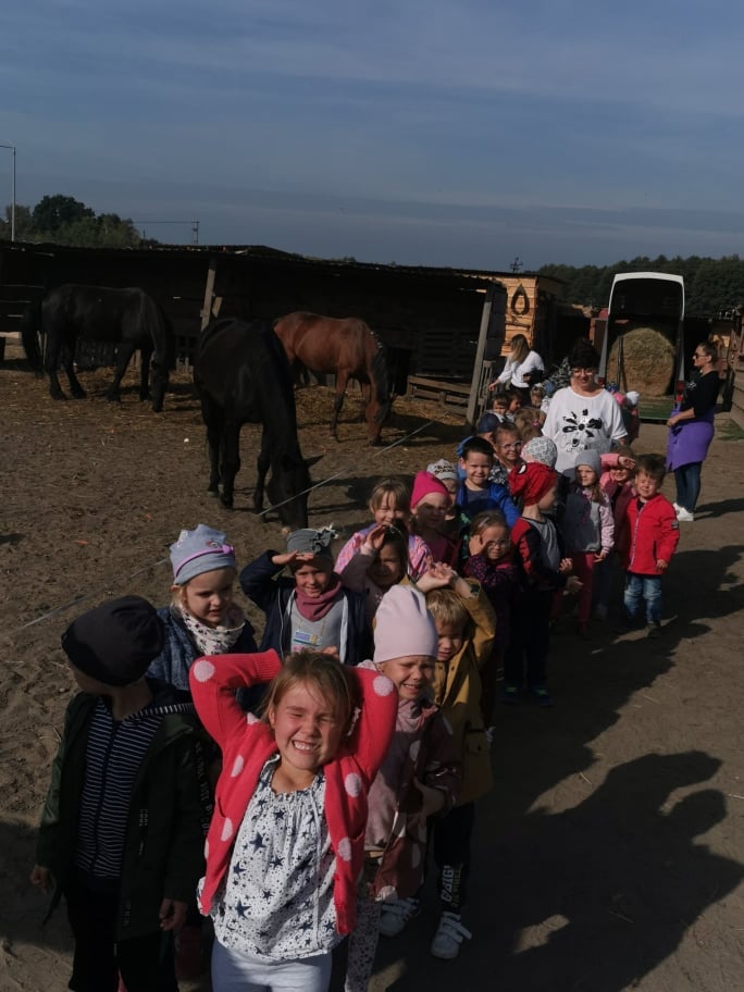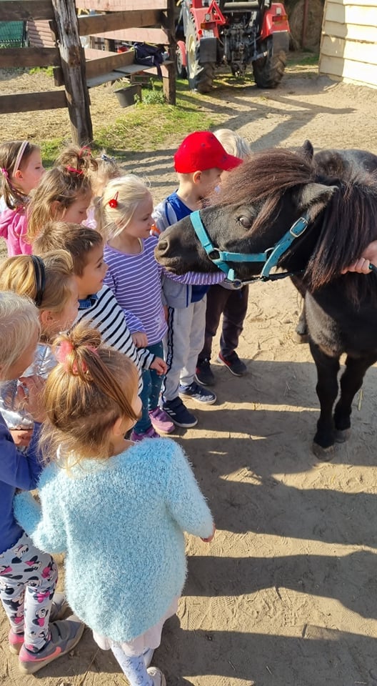 I tak 4.10 Nasze Przedszkolaki z jabłkami i marchewką pod pachą udały się do Stajni u Picia, gdzie czekały na Nich piękne Konie, które mogli nakarmić oraz pogłaskać a nawet przytulić się.